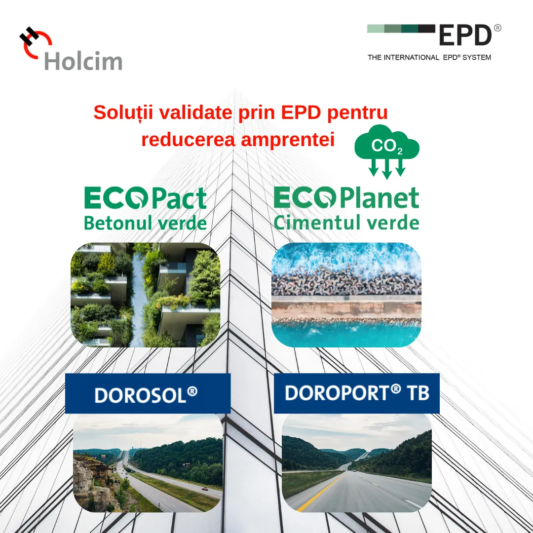 - Holcim, prima companie de construcții din România care a publicat Environmental Product Declaration (EPD) pentru produsele fabricate local, devine și primul producător de materiale de construcții cu soluții și produse atestate pentru reducerea amprentei de CO2, conform aceluiași instrument